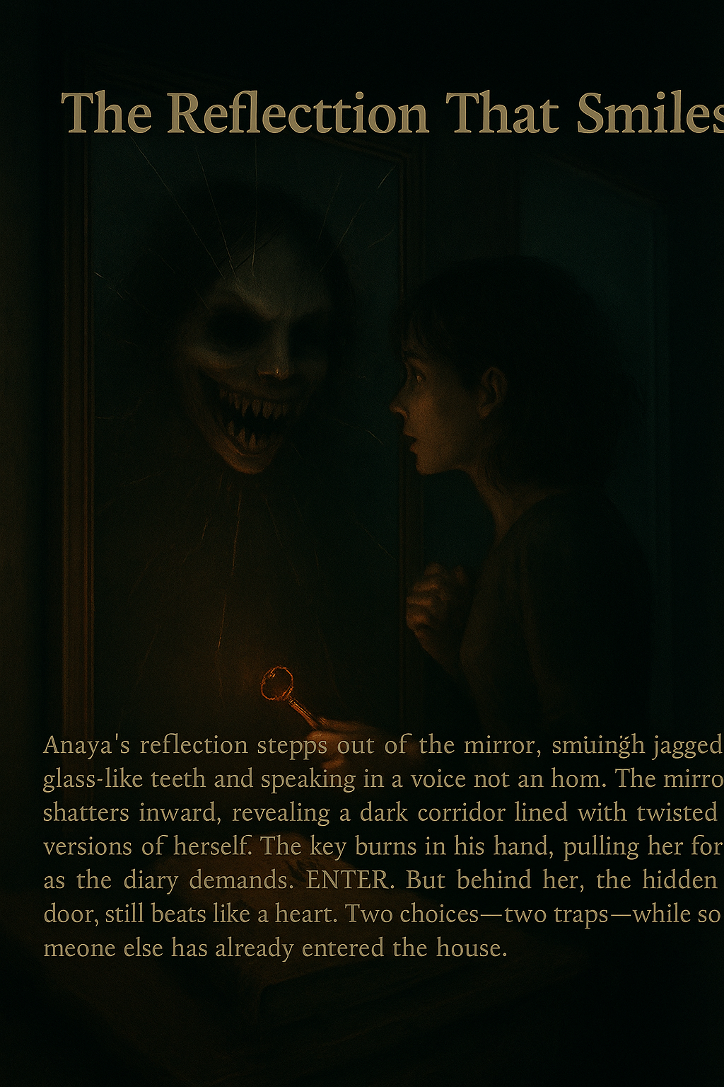 Anaya’s reflection steps out of the mirror, smiling with jagged, glass-like teeth and speaking in a voice not her own. The mirror shatters inward, revealing a dark corridor lined with twisted versions of herself. The key burns in her hand, pulling her forward, as the diary demands: ENTER. But behind her, the hidden door still beats like a heart. Two choices—two traps—while something else has already entered the house.
