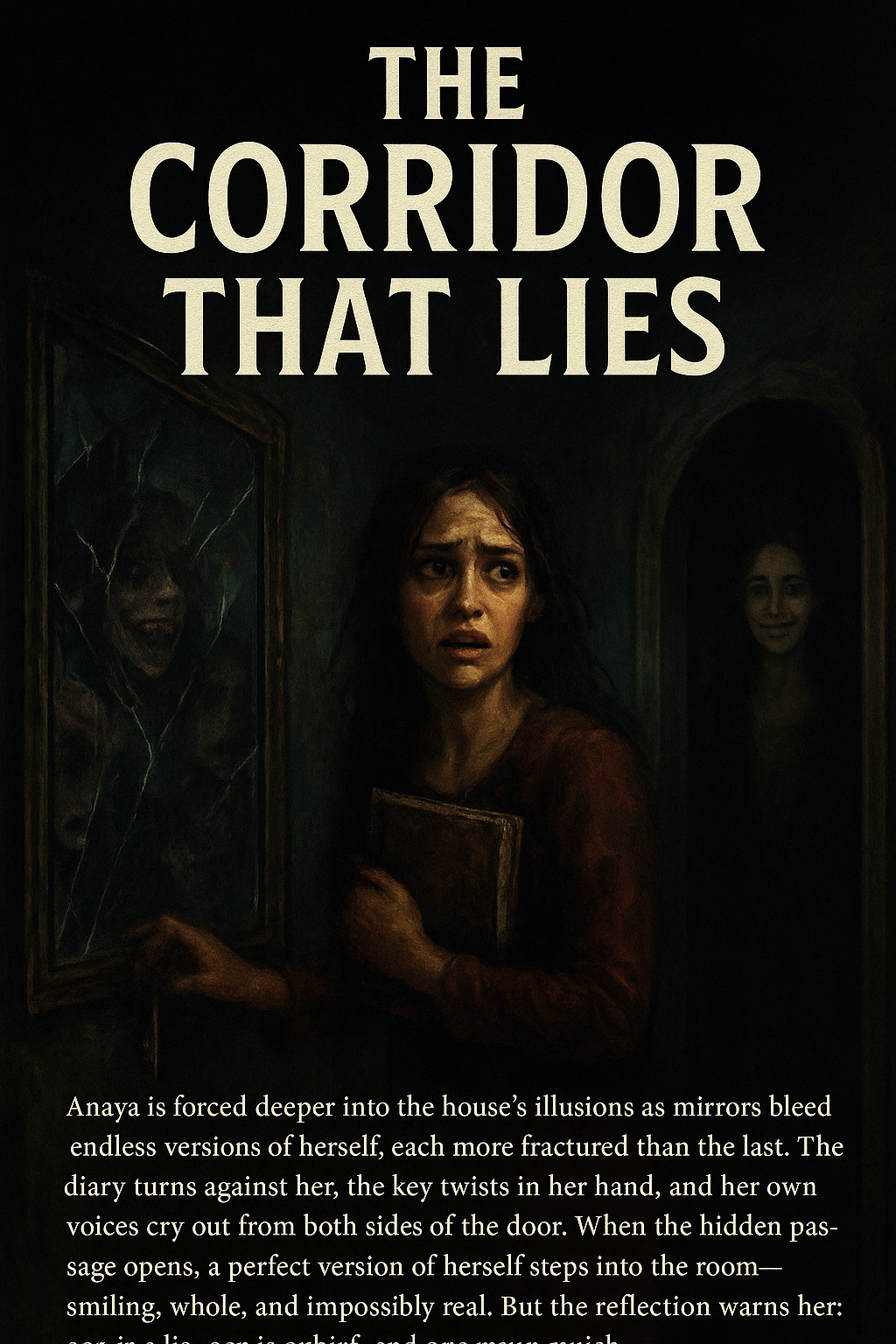 Anaya is forced deeper into the house’s illusions as mirrors bleed endless versions of herself, each more fractured than the last. The diary turns against her, the key twists in her hand, and her own voices cry out from both sides of the door. When the hidden passage opens, a perfect version of herself steps into the room—smiling, whole, and impossibly real. But the reflection warns her: one is a lie, one is a thief, and one must vanish.
