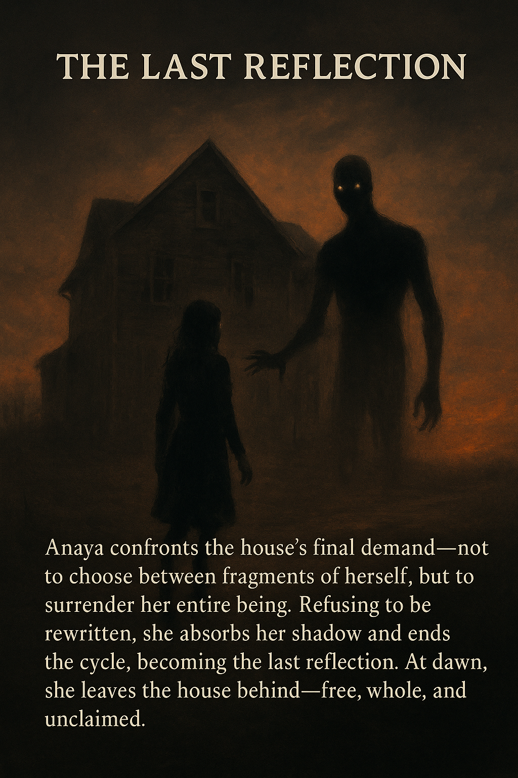 Anaya confronts the house’s final demand—not to choose between fragments of herself, but to surrender her entire being. Refusing to be rewritten, she absorbs her shadow and ends the cycle, becoming the last reflection. At dawn, she leaves the house behind—free, whole, and unclaimed.
